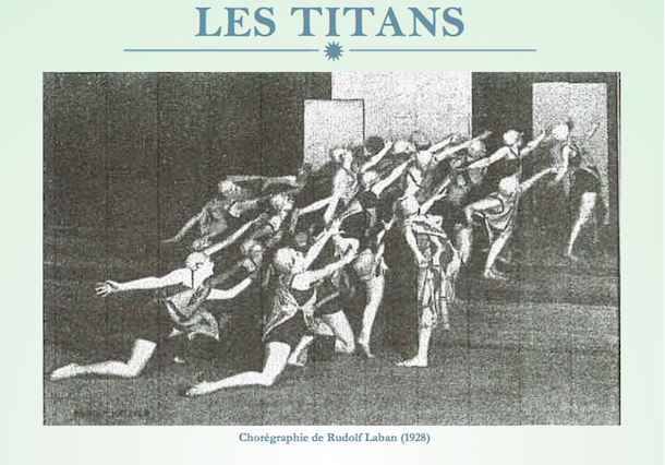 Titan (1928), œuvre du chorégraphe et théoricien allemand Rudolf Von Laban (1879-1958) est une vaste danse chorale pour amateurs. L’enjeu de ces chœurs en mouvement dans les années 1930 est le partage, « l’expérience de la joie de se mouvoir ensemble » écrit Laban. Il s’agit, alors que l’Europe de prépare à la guerre et que l’Allemagne laisse venir les années les plus sombres de son histoire, de tisser des liens sociaux entre les êtres.