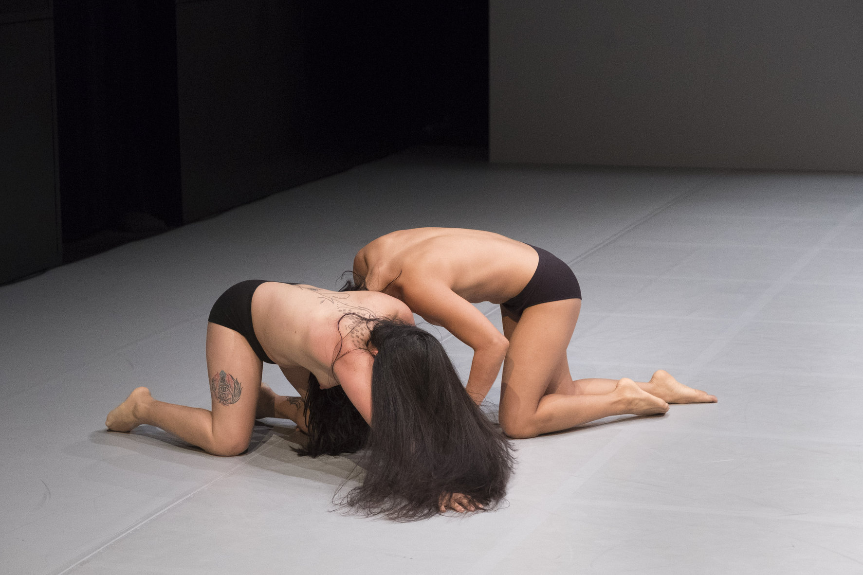 Et entre, depuis le front de scène, une seconde interprète (Irene Martinez) laquelle illico se déshabille et nue fait face. Elle s'entortille de quelques vêtements, les laisse tomber, essaie une fourrure comme si plus aucune identité vestimentaire ne pouvait convenir à ce corps dévasté par un séisme inexpliqué. Les deux femmes vont affronter le public, dans un jeu de fixation yeux dans les yeux d'autant plus troublant que ces corps nus sont à portée de main, s'étant aventurées jusqu'aux escaliers des gradins. Mais là encore, aucun apaisement. Les danseuses remontent, s'éloignent, se collent au mur, s'en désespèrent, dans ce trouble mélange d'émotions qui les traversent. Les pauvres culottes en sont martyrisées dans une lutte acharnée pour les enlever de rage tout en les gardant. Sorte de tunique de Nessus au rayon lingerie… Et dans cette étrange qualité de mouvement comme étale qui préside depuis le début et qui va durer jusqu'au terme, dans le noir qui absorbe ces corps réunis par une gestuelle parallèle autant qu'apparemment sans espoir.