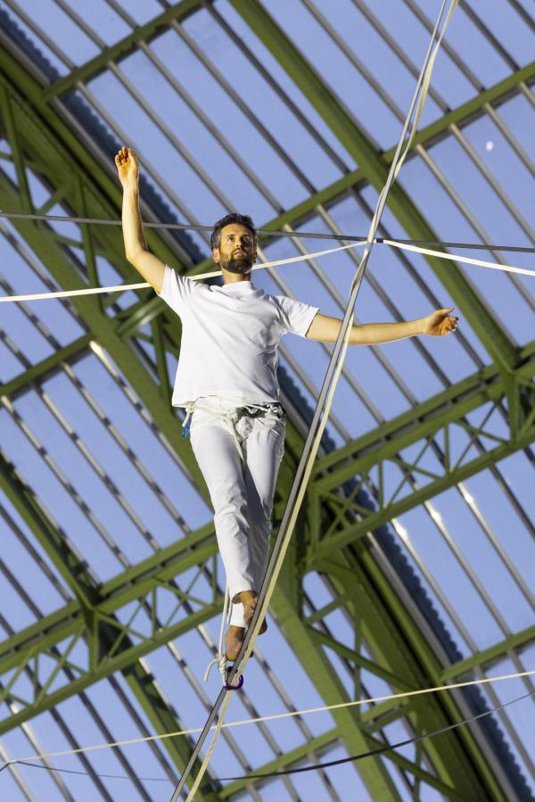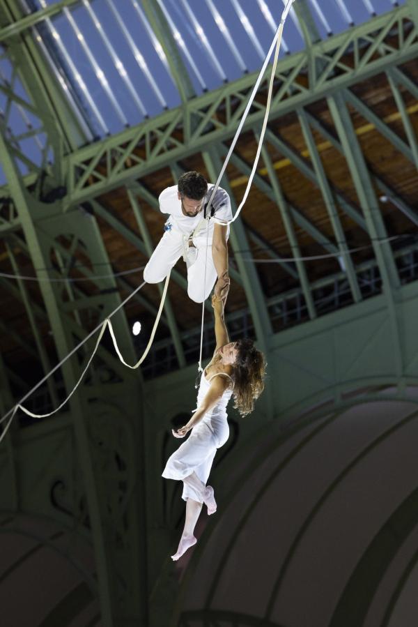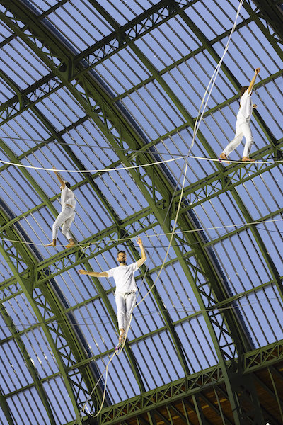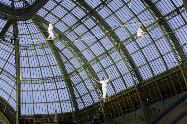 Les Highliners prennent le relais sur leurs filins élastiques, inventant une nouvelle discipline qui serait le trempoline sur fil, donnant, avec un effet d’accélération renversant, cette impression de Vertige annoncée dans le titre. Cette installation imaginée par Nathan Paulin n’est pas sans rappeler ses exploits passés : traversée de la slackline entre la tour Eiffel et le Trocadéro, performance sur les hauteurs du Mont-Saint-Michel… Ici, il tisse une toile céleste qui révèle la poésie du vide chère à Ouramdane, avec qui il a déjà collaboré sur Les Traceurs, Corps extrêmes ou Outsider. Mais ici, sous la verrière du Grand Palais, on dirait une volière d’où s’élancent une nuée d’oiseaux blancs qui se perchent ici ou là sur des fils entrecroisés, au bord du ciel comme au seuil de l’envol.