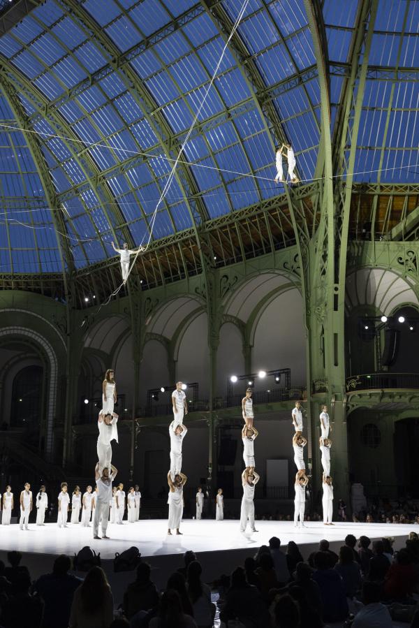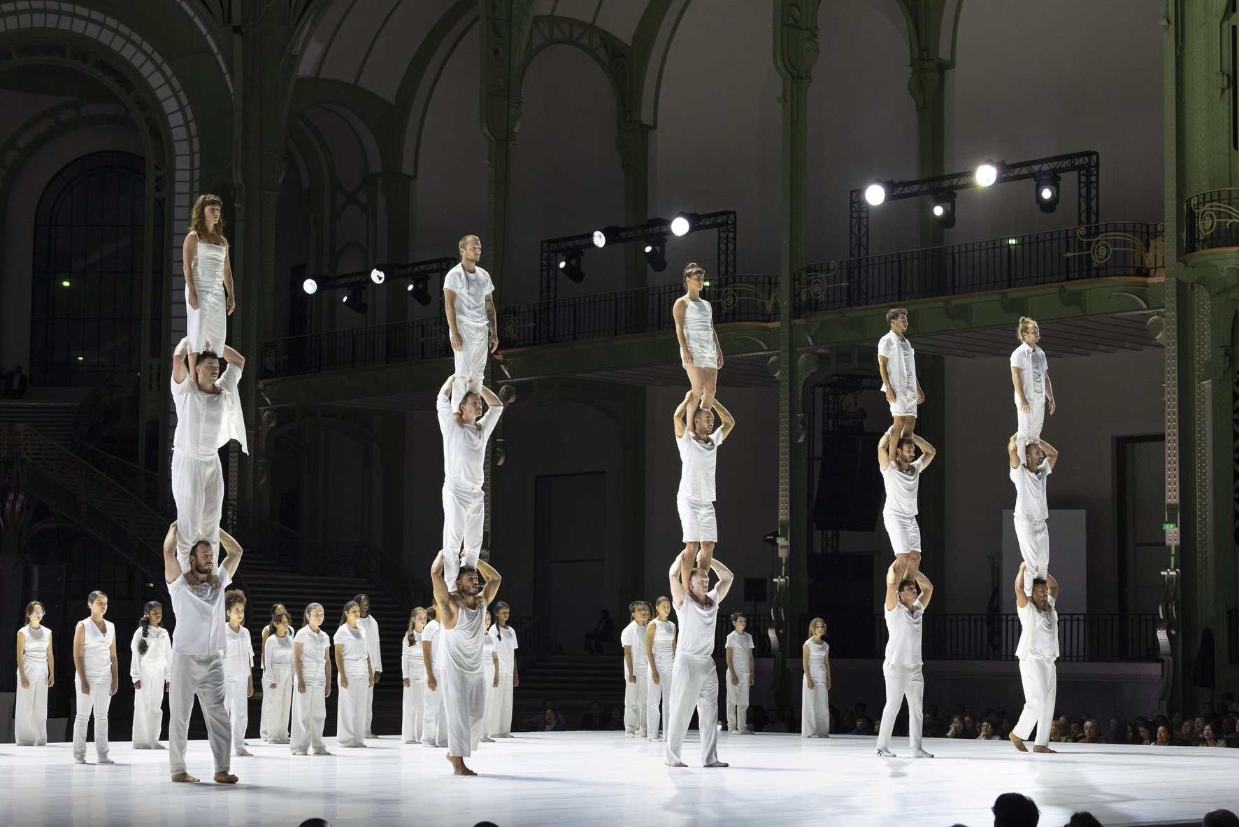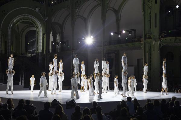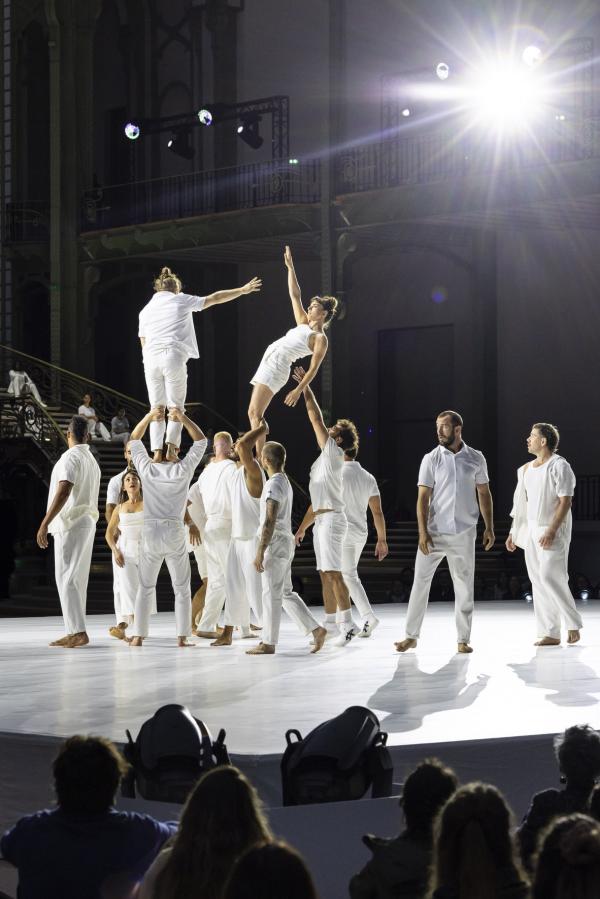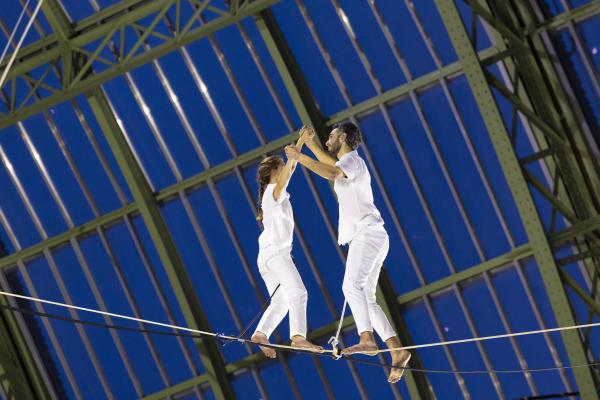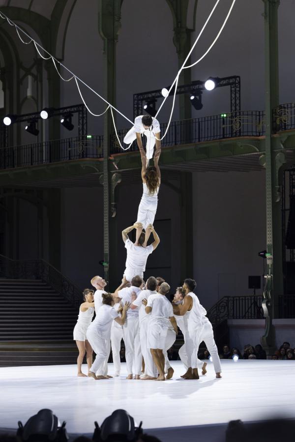Imaginé comme une traversée sensorielle, huit funambules dirigés par le célèbre Nathan Paulin, habitent donc les volumes vertigineux de la nef, déployant un langage physique aussi poétique que spectaculaire. Dans les hauteurs, des silhouettes vêtues de blanc défient le vide, marchant sur des câbles tendus à plus de 35 mètres du sol. En contrebas, danseurs et voltigeurs dessinent des trajectoires fluides sur un vaste plateau immaculé. Sur les balcons, les chanteurs de la maîtrise de Radio France se mêlent à la composition originale de Christophe Chassol, accompagné de Mathieu Edouard et Jocelyn Mienniel. Occupant tous les espaces de cette structure de 8500 tonnes d’acier et de verre, inaugurée en 1900 pour l’Exposition Universelle, et résumant les goûts de la Belle Époque, avec son escalier métallique à double révolution teinté d’Art nouveau, c’est un grand spectacle qui se déploie sous nos yeux.