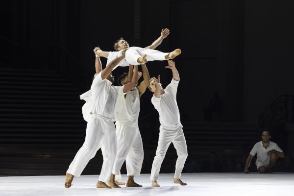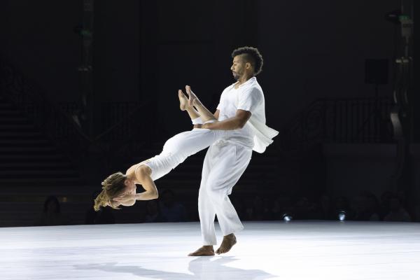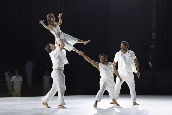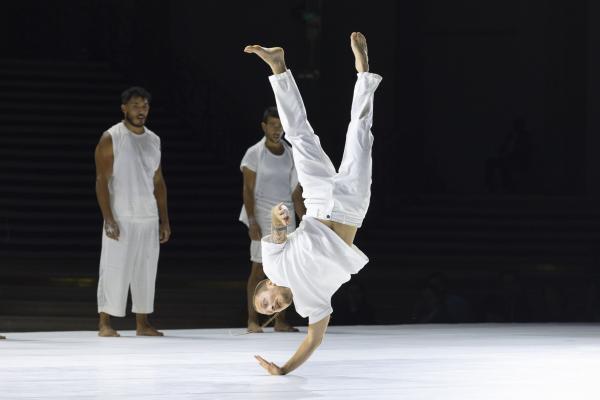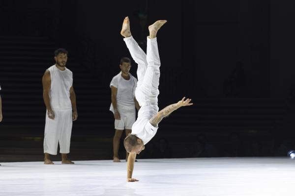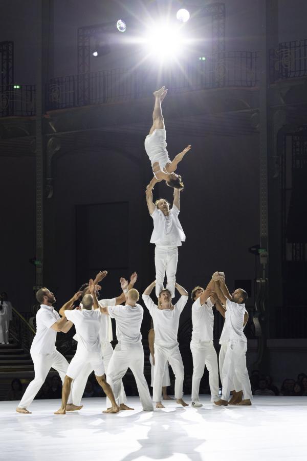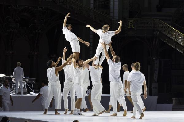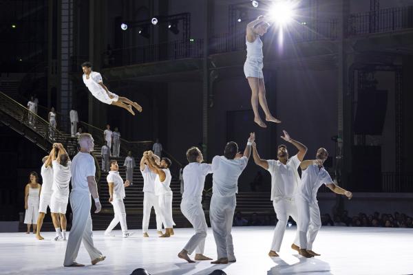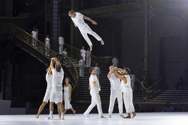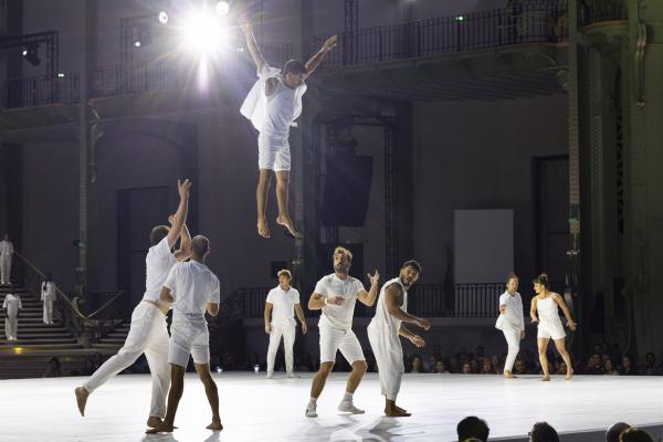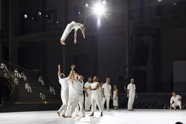 La mise en scène, pensée comme un puzzle en mouvement, fait dialoguer toutes les strates du Grand Palais. Des figures se répondent à distance, des corps se rejoignent l’espace d’un instant : un funambule descend du ciel pour effleurer une danseuse au sol, des tours humaines se construisent et se délitent au gré de la chorégraphie. Rachid Ouramdane nous surprend encore avec ses trouvailles dans les voltiges, comme ces acrobates qui passent de bras en bras comme on voyagerait dans les airs, ces doubles saltos complétement à la verticales, ces portés sensationnels à trois étages où la troisième personne vole littéralement à l’horizontale !