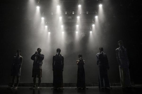 Les deux danseurs et quatre danseuses sont déjà sur scène à l’arrivée du public. Une estrade luisante et six pieds de micro constituent le décor de la dernière création de Jan Martens, VOICE NOISE. Ce chorégraphe belge qui fait partie des neufs artistes associés de la Maison de la Danse revient à une forme plus resserrée que ses précédentes productions pour explorer les voix de femmes oubliées. S’inspirant de l’essai d’Anne Carson, The gender of sound, il construit son spectacle comme une mosaïque de sons et de mouvements. A partir d’une quinzaine de morceaux de 1935 à 2023 de compositrices « confidentielles » pour la plupart, se déroulent des séquences, en solo ou en groupe, plus ou moins sophistiquées, plus ou moins longues, correspondant aux enregistrements.